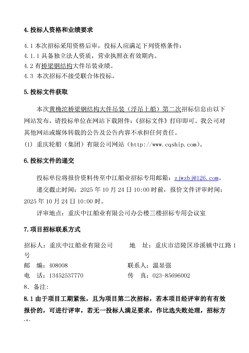 中江公司黃桷沱橋梁鋼結構大件吊裝(浮吊上船)招標公告 (第二次)
